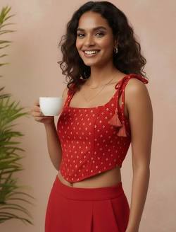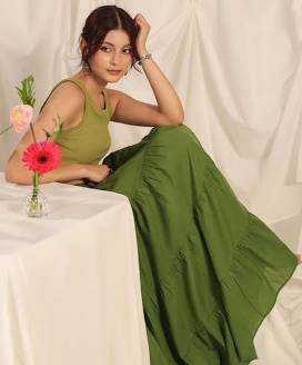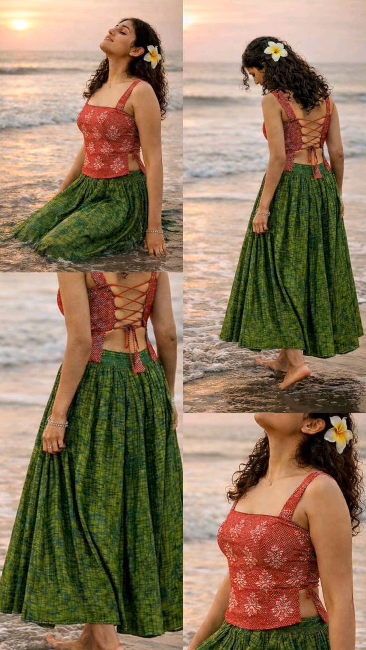 While scrolling late at night, I decided to put together my own custom Myntra Boho Outfit. Instead of buying a pre-made set, I found two separate pieces that I thought would look incredible together: a beautiful red printed corset top and a flowy olive green maxi skirt.