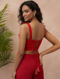 Tying the Back: Because the red top laces up entirely in the back, you might need a friend or your partner to help you pull the strings tight and tie the knot evenly the first time you put it on!