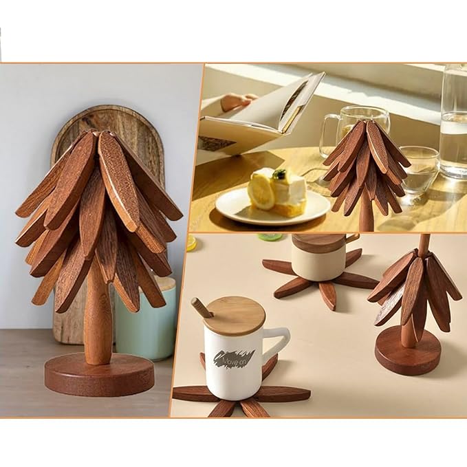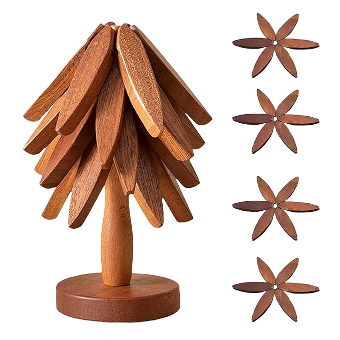 The coolest feature is the storage mechanism. The set comes with a central wooden stand. When the 4 trivets are not in use, they slot onto the stand vertically, resembling a Pine Tree or Christmas Tree. It saves precious drawer space and looks aesthetic on your countertop or open shelving.